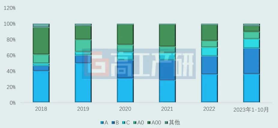 近幾年,我國新能源乘用車高端化趨勢明顯。2023年1-10月,新能源乘用車B級(jí)及以上車型占比達(dá)到46.4%,2022年則為35.2%。隨著電池價(jià)格下降,B級(jí)及以上車型產(chǎn)品價(jià)格的同步下降,再加上更多具有競爭力B級(jí)及以上車型產(chǎn)品的推出,預(yù)計(jì)2024年我國B級(jí)及以上車型銷量占比有望達(dá)到50%。