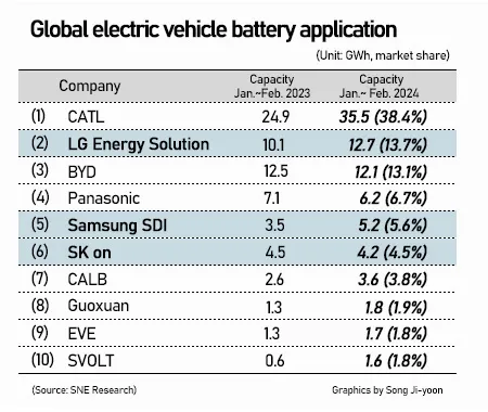 4月8日,韓國(guó)研究機(jī)構(gòu)SNE Research發(fā)布全球動(dòng)力電池統(tǒng)計(jì)數(shù)據(jù),今年前2個(gè)月LG新能源動(dòng)力電池裝車量為12.7GWh,超過裝車量為12.1GWh的比亞迪。兩家公司分別位列榜單第二和第三位,相較于今年1月的排名發(fā)生互換。