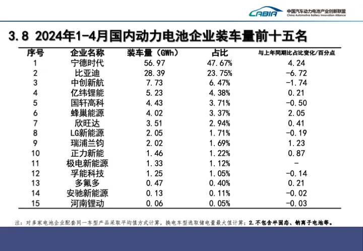 今年4月,寧德時代國內動力電池裝車量達15.65 GWh,市占率為44.65%,仍穩(wěn)居榜首,但較前一月出現小幅下滑。排在第二位的比亞迪4月國內動力電池裝車量為9.95 GWh,市占率為28.37%,環(huán)比增長了1.58個百分點。