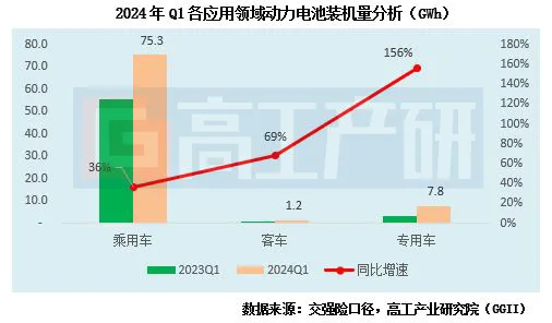 From the perspective of installed capacity application, in the first quarter of 2024, the installed capacity of new energy passenger vehicles was about 75.3 GWh, a year-on-year increase of 36%; The installed capacity of new energy buses is about 1.2GWh, a year-on-year increase of 69%; The installed capacity of new energy vehicles is about 7.8GWh, a year-on-year increase of 156%.