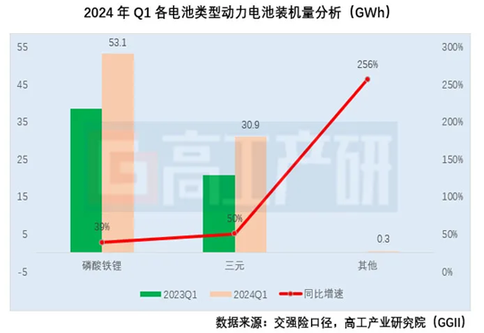 From the perspective of installed capacity and battery types, the installed capacity of lithium iron phosphate power batteries in the first quarter of 2024 was about 53.1 GWh, a year-on-year increase of 39%, with a market share of 63%, a decrease of 2 percentage points from the same period last year. This is mainly due to the increase in sales of ternary based extended range and plug-in hybrid models. The installed capacity of ternary power batteries is about 30.9GWh, a year-on-year increase of 50%, with a market share of 36.7%, an increase of 1.8 percentage points compared to the same period last year.