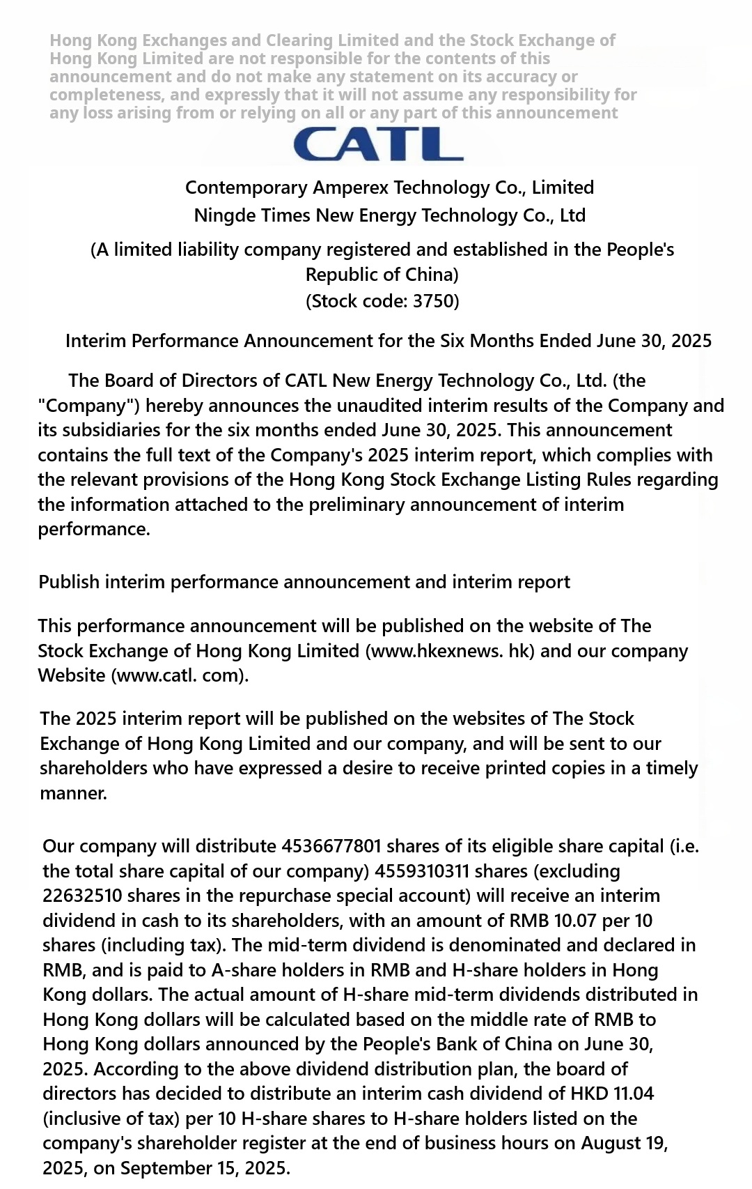 While achieving rapid development, CATL values returns for investors. According to the 2025 mid-term dividend plan, CATL will distribute a cash dividend of 10.07 yuan (including tax) for every 10 shares to all shareholders, with a total dividend amount of 4.573 billion yuan. CATL hopes to further enhance investors' sense of gain by increasing the frequency of dividends.