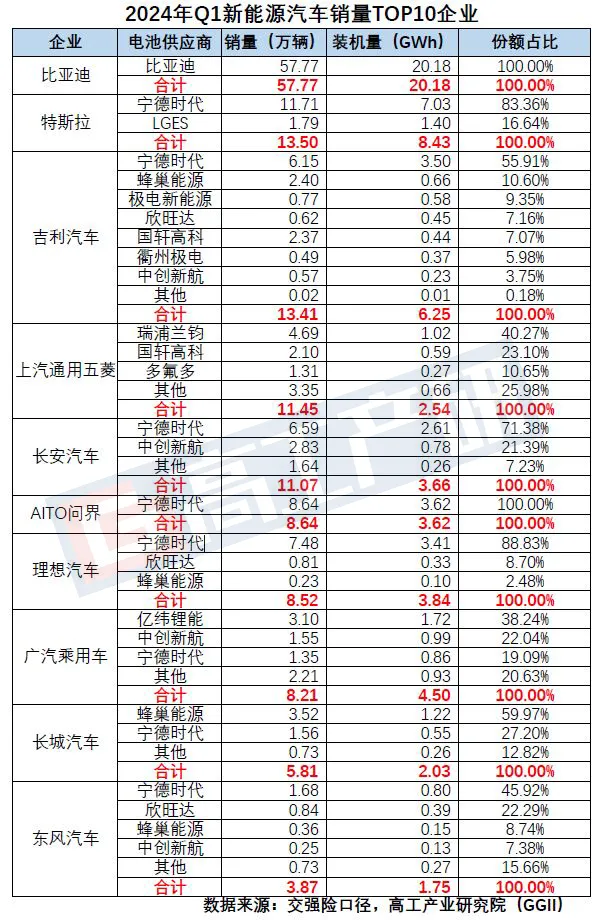 在新車上市、降價促銷以及以舊換新政策刺激下,2024年第一季度國內(nèi)新能源汽車延續(xù)快速增長勢態(tài)。高工產(chǎn)業(yè)研究院(GGII)根據(jù)新能源汽車交強險口徑數(shù)據(jù)統(tǒng)計顯示,2024年第一季度我國新能源汽車銷售約183.3萬輛,同比增長45%,帶動國內(nèi)動力電池裝機量約84.3GWh,同比增長43%。其中,第一季度新能源汽車銷量前十企業(yè)合計裝機約56.8GWh,占整個動力電池裝機量的67.4%,寧德時代和比亞迪動力電池分別配套銷量前十企業(yè)49%和37%的份額。