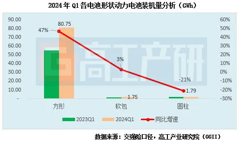 從不同電池形狀來看,2024年第一季度方形動力電池裝機量約80.75GWh,同比增長47%;軟包動力電池裝機量約1.75GWh,同比增長3%;圓柱動力電池裝機量約1.79GWh,同比下降21%。